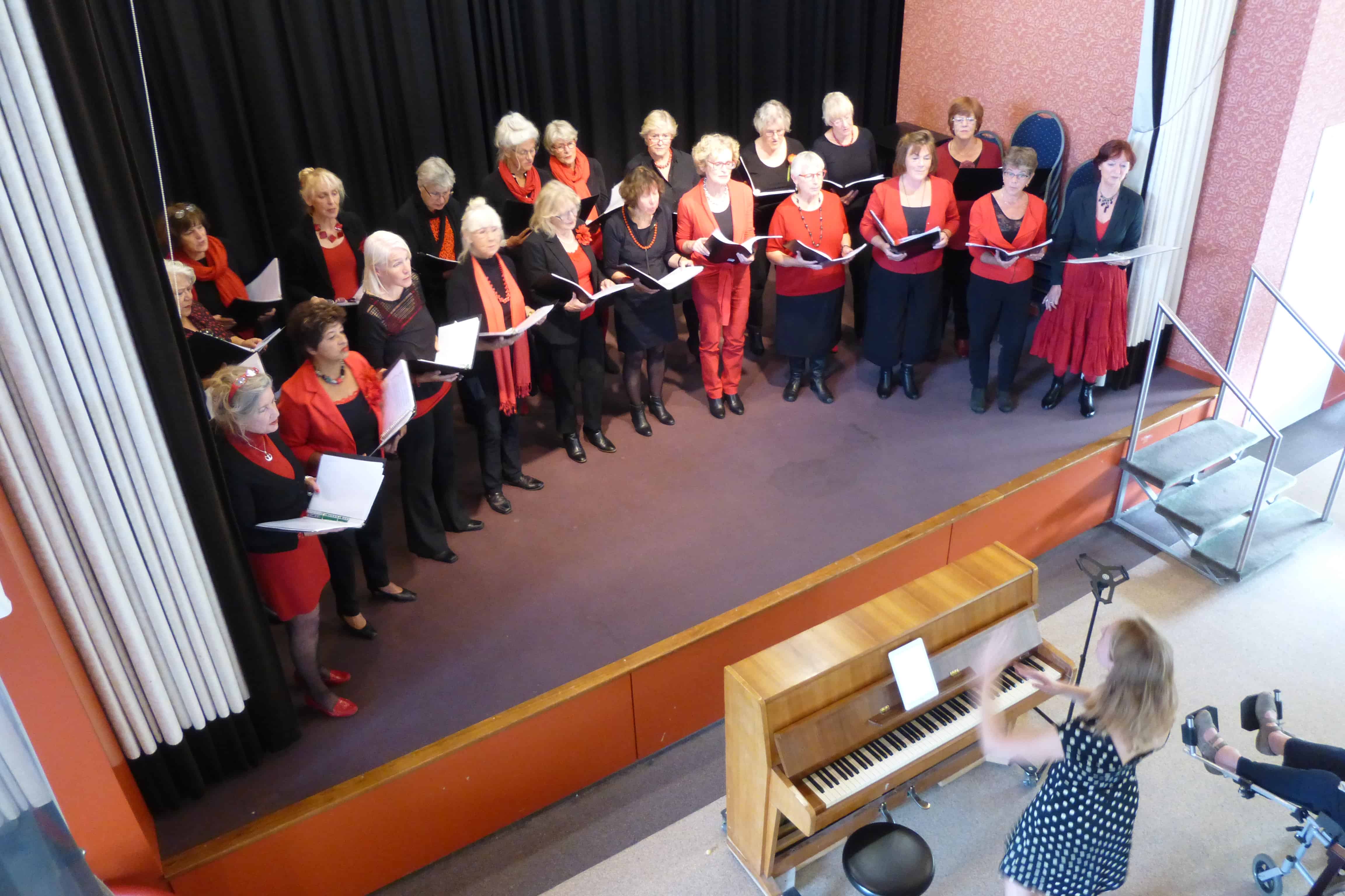 Ruim 20 vrouwen, de meesten van middelbare leeftijd, staan in een halve kring gezellig dicht bij elkaar. De jonge dirigente Ruth Klijn leidt hun vriendelijk maar resoluut door een afwisselend programma van 7 liederen. Aan de piano Lisanne van de Sande.